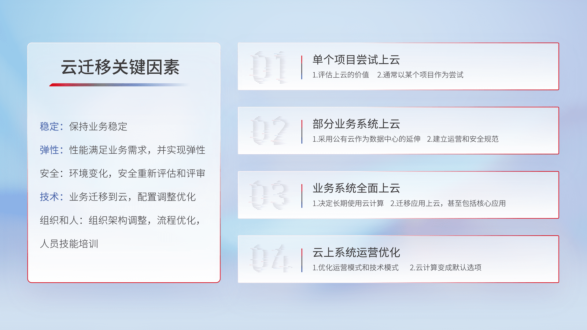 结合实际业务,,,从规划设计、、、云平台选型、、、云原生改造、、数据迁移、、集成交付,,迁移全过程为客户识别最佳上云路径,,,,做好风险识别管理,,,设计网络架构、、、、身份权限、、、、安全审计合规、、、、操作审计、、、日志审计、、、监控告警策略、、、、多站点容灾设计等,,对云上基础设施进行整体规划,,提升IT治理水平,,以满足弹性、、、高可用、、、高性能的需求。。。
