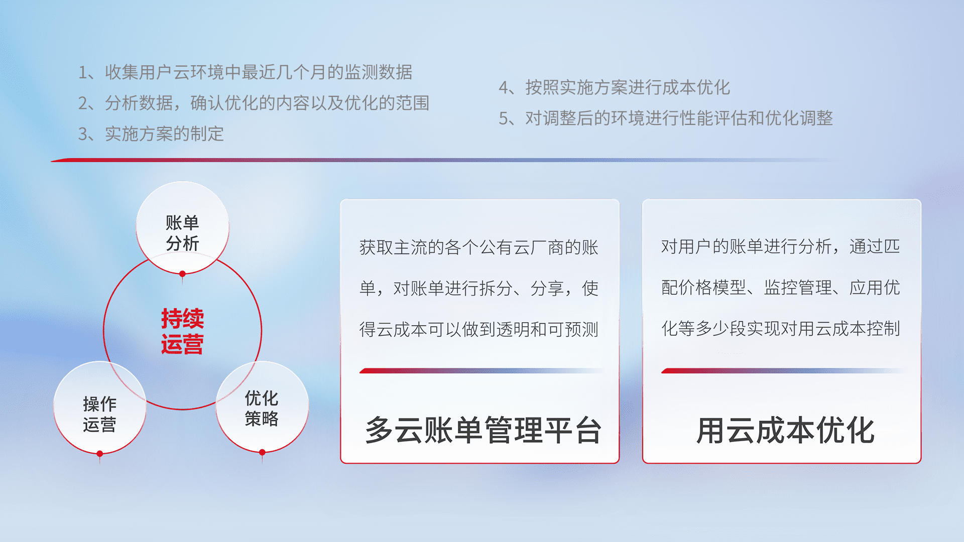 通过多云纳管,,以统一的资源数据模型把客户的云资源进行抽象和封装,,,进而实现对多云资源的统一操作,,,保障云资源管理的可靠性、、、、稳定性与可用性。。。。量身定制化运维内容,,,,配置、、开发运维、、、、补丁管理、、、、备份、、、监控、、认证和访问管理、、、审计和日常巡检等,,,保障在用云过程中的可靠度,,,,稳定度以及高可用率。。。